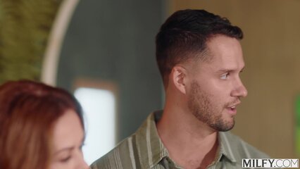 Эти двое отправились в свадебное путешествие и заселились в апартаменты, которые любезно предоставила рыжая домохозяйка, обещая, что будет ухаживать за ними, готовить и делать всё, чтобы они чувствовали себя как дома. Вот только брачная ночь не задалась - жена не захотела сосать с заглотом - уж слишком член у муженька оказался толстым, а потом они и вовсе поругались и разошлись по разным комнатам. Но не пропадать же такому стояку? Да и МИЛФа ходит вся такая недотраханная